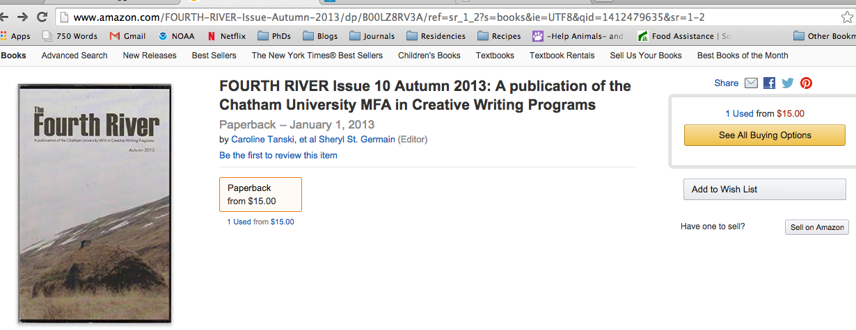Anyway, this is of course untrue. I edited the issue, but did not write it. Secondly, “et al” could not begin to cover the passion and dedication of everyone else who helped make that issue happen. Thirdly, some fool is trying to sell this copy for $15 on Amazon. If you want to read the issue (and you should, it’s great), go to The Fourth River’s website and buy it for $10.
